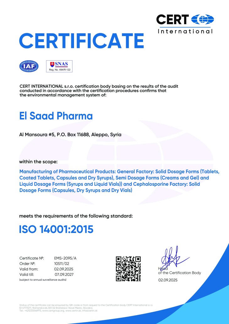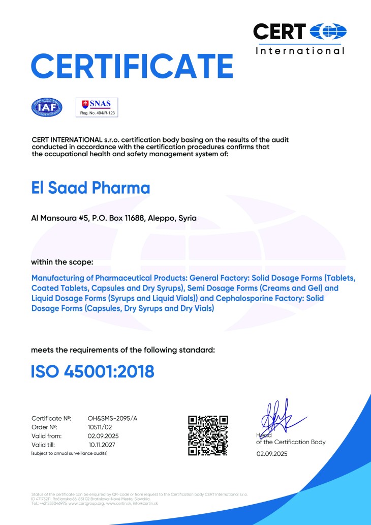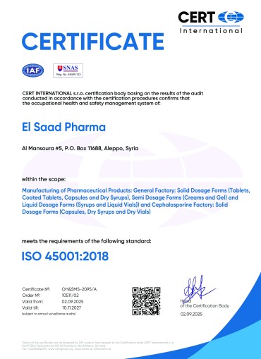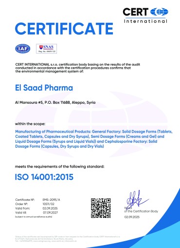 ELSaad Company for Pharmaceutical Industries relies on principles that ensure the establishment of systems of quality, environment, health and safety, and works to implement them in accordance with the goal and context of the company and support its strategic path.